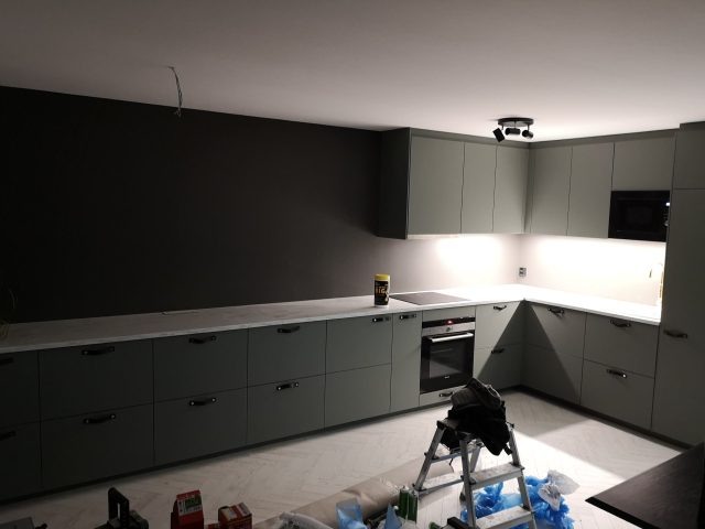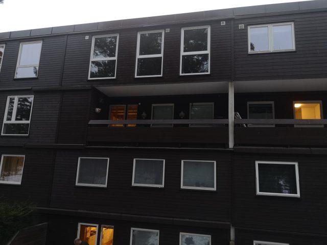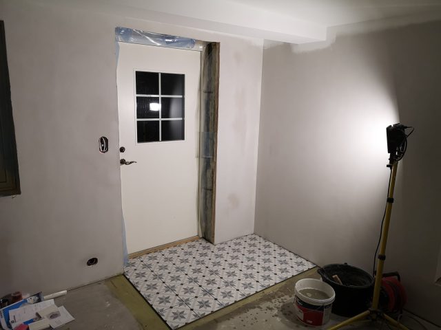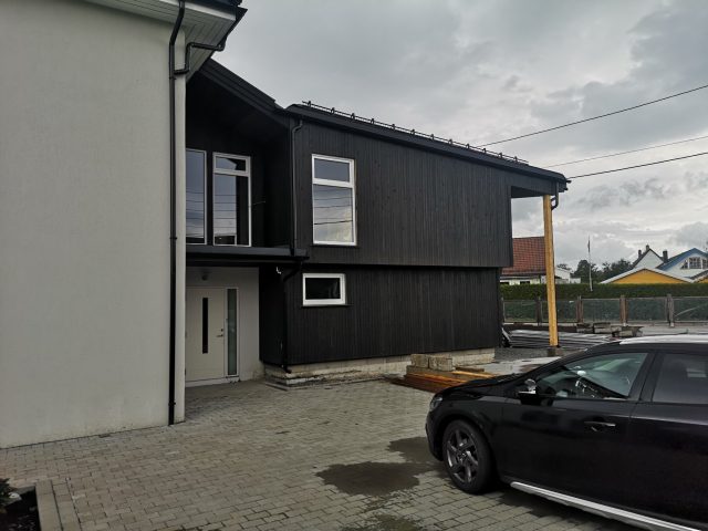 Huset på Flåtestadveien i Oppegård har gjennomgått en renovering, inkludert installasjon og gipsing av vegger, maling, nytt gulvbelegg, og installasjon av skyvedør.