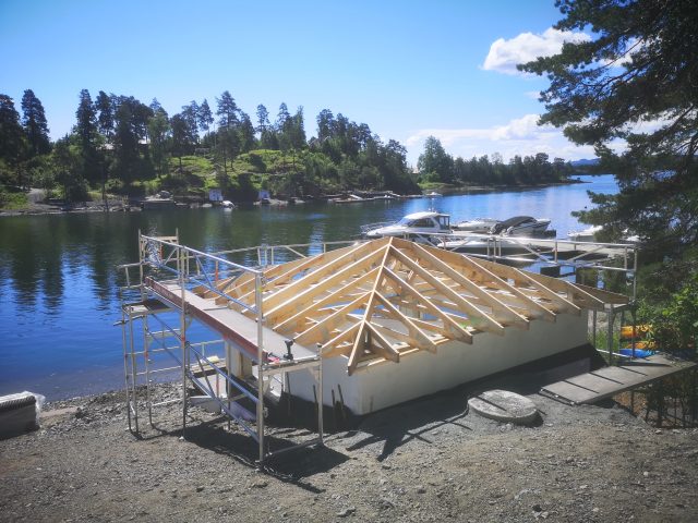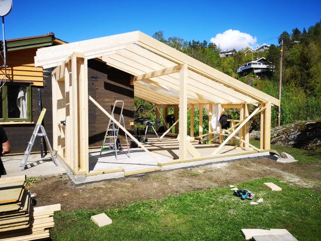 Fundamentet er satt, rammen er bygget, vinduene er installert, ytterveggene er ferdigstilt, isoleringen er montert, og el-installasjonen er ferdig (klar for strøm).
