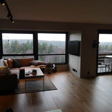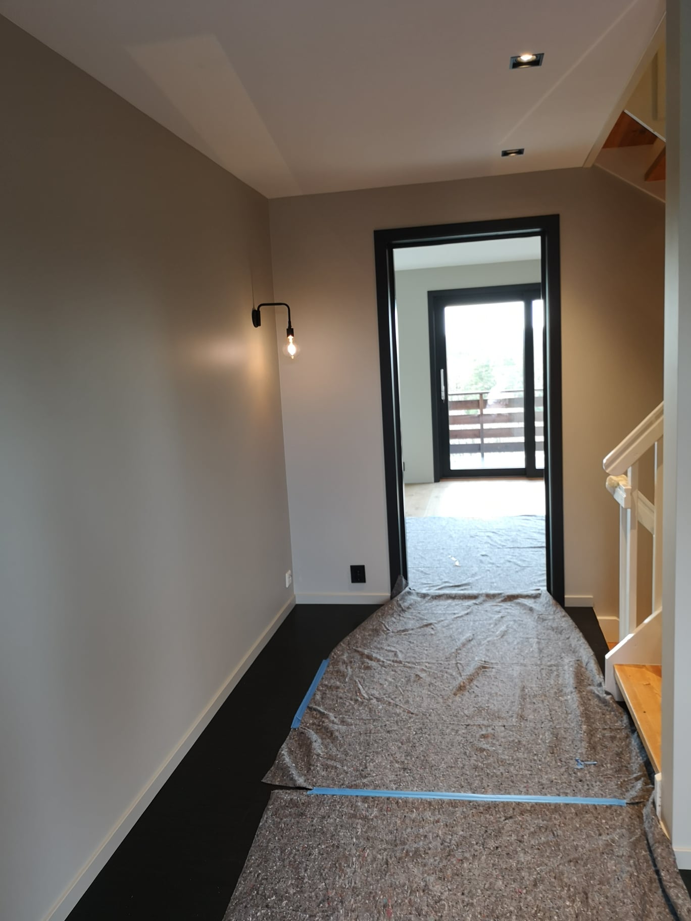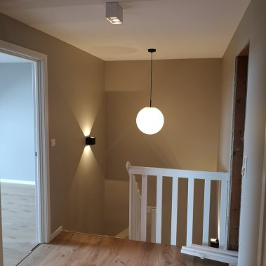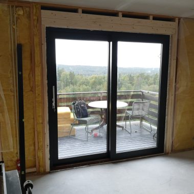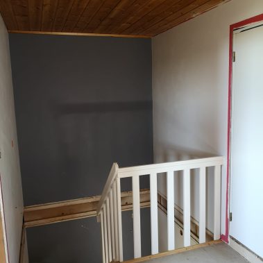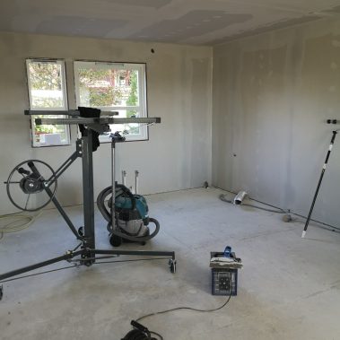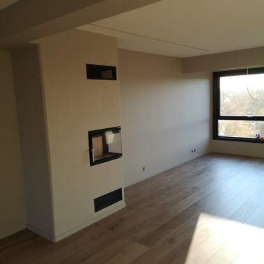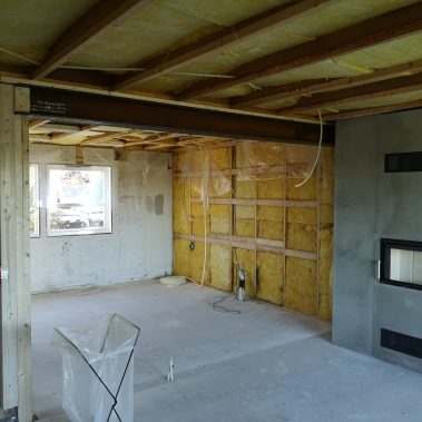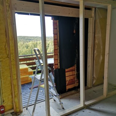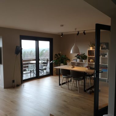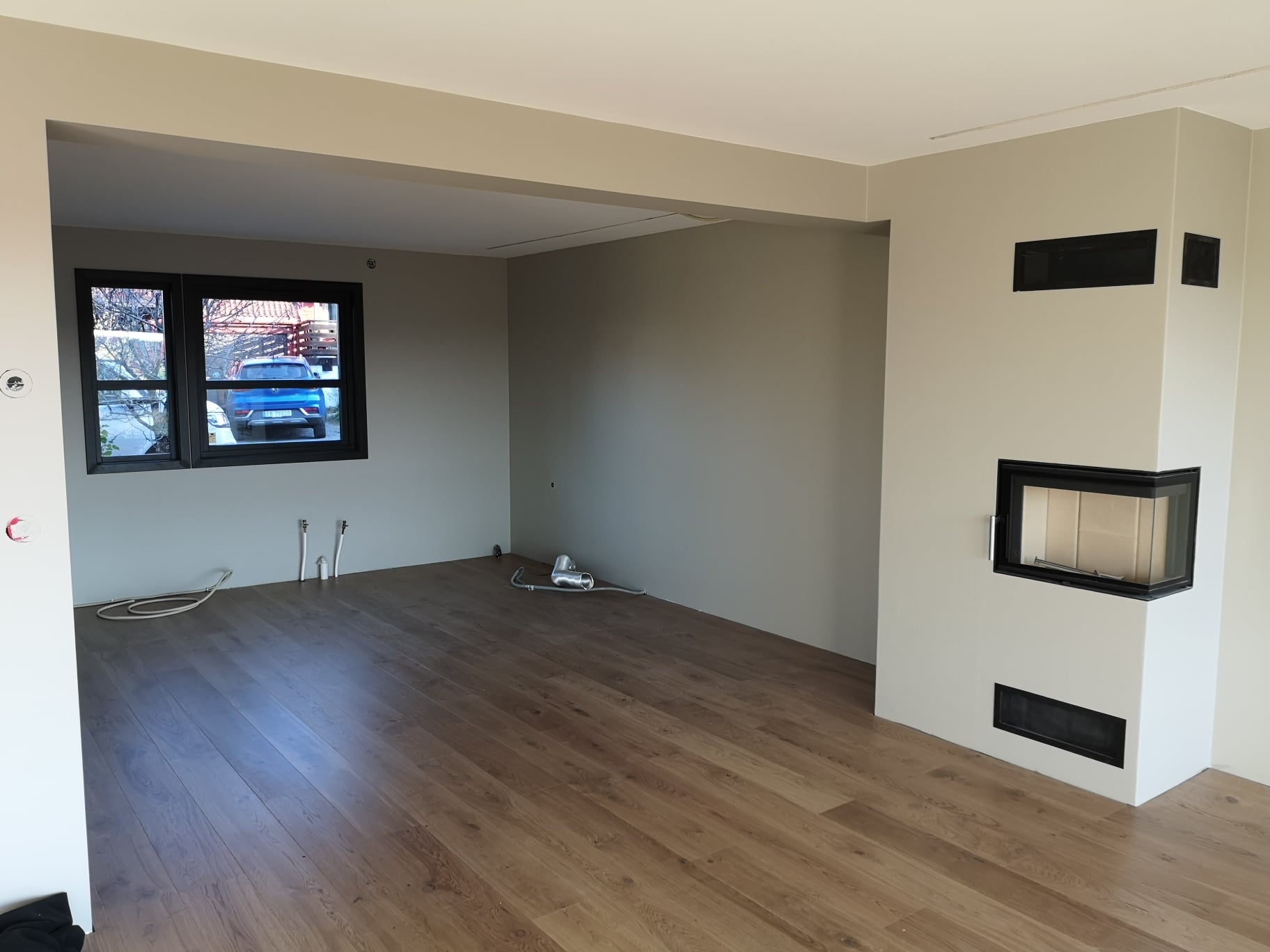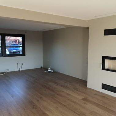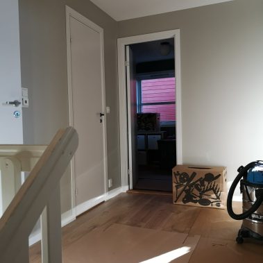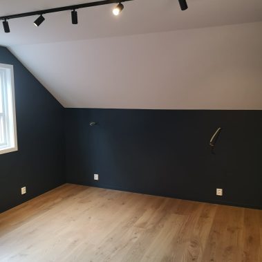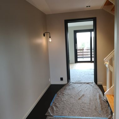 Huset på Flåtestadveien i Oppegård har gjennomgått en renovering, inkludert installasjon og gipsing av vegger, maling, nytt gulvbelegg, og installasjon av skyvedør.